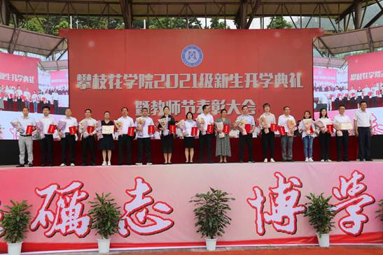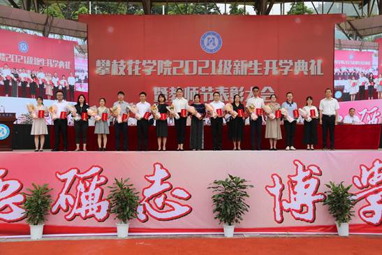 典礼上,马克思主义学院院长、全国优秀教师、全国思想政治理论课优秀老师、四川省首届教书育人名师朱云生教授,钒钛学院教授、硕士生导师田从学博士,体育部主任杨领航副教授,外国语学院辅导员、曾荣获市“优秀班主任”、寻找央视《朗读者》节目“十强选手”等荣誉称号的何旋老师,学生公寓管理员、曾荣获省“学生公寓管理与服务先进个人”、十大“最美公寓人”等荣誉称号的刘小红老师组成教师代表团队,分别从“德、智、体、美、劳”五个方面寄语新生要明大德、守公德、严私德,胸怀大志、知行合一,强身健体、健全人格,发现美、追求美,崇尚劳动、热爱劳动,以“自律”为引领,不负青春、不负韶华,五育并举,做有理想、有本领、有担当的新时代大学生!