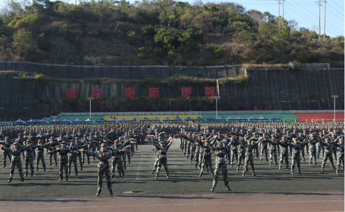 伴随着分列式进行曲,各受阅方队迈着整齐统一的步伐,喊着高亢响亮的口号依次走过主席台接受检阅。