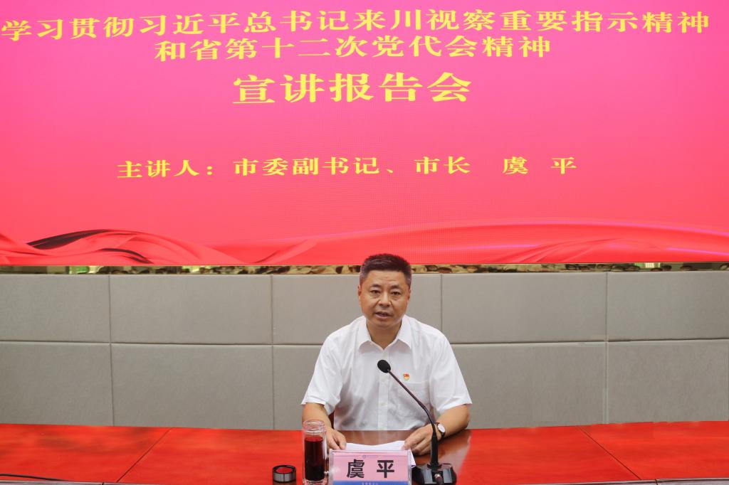 6月29日下午,市委副书记、市长虞平在我校宣讲习近平总书记来川视察重要指示精神和省第十二次党代会精神并作形势政策报告。校党委书记王斌主持报告会。党委副书记、校长王曙光出席报告会。
