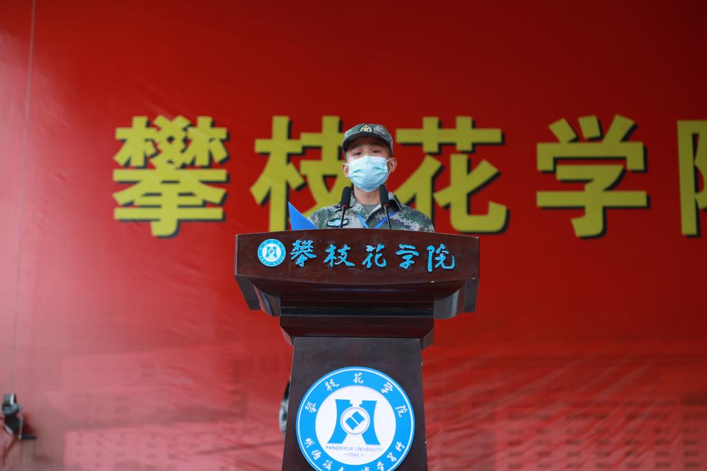军训教官代表、基础医学院临床医学专业钱祖鑫代表学生教官发言。他表示将做好表率、尽职尽责,以高昂的热情、严格的要求全身心投入军训工作中,确保此次军训任务高标准、高质量完成。