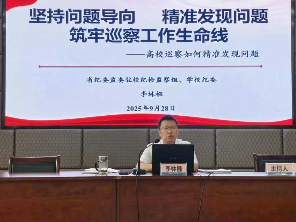 928日上午,省纪委监委驻校纪检监察组组长、校党委副书记、纪委书记、巡察工作领导小组常务副组长李林襁以“坚持问题导向,精准发现问题,筑牢巡察工作生命线”为题作专题辅导。他对“模拟问题、核实问题、问题台账、突出问题与线索问题”的“四步走”工作法进行了系统阐述,为精准发现、深入研判问题提供了清晰的方法路径。他指出,巡察干部要牢固树立问题意识,增强发现问题的敏锐性和精准度。