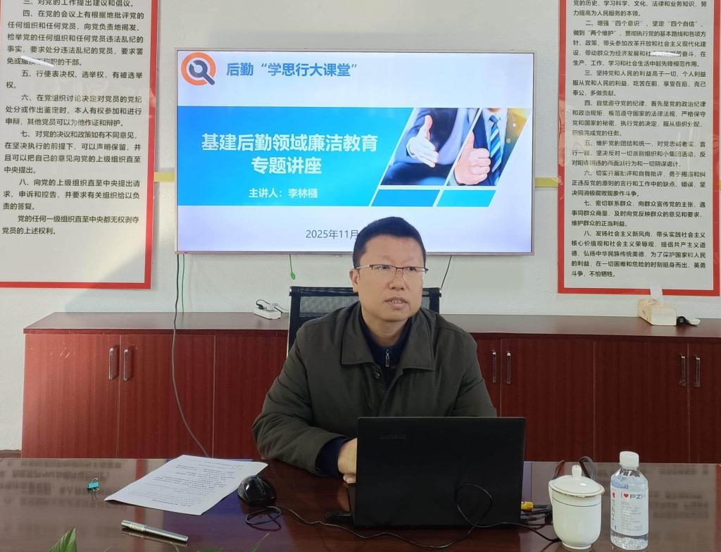为深入推进全面从严治党,切实增强基建后勤领域干部职工的廉洁自律意识和风险防控能力,1127日,省纪委监委驻校纪检监察组组长、党委副书记、纪委书记李林襁在后勤服务中心为后管处干部职工作了一场主题鲜明、内容深刻的廉洁教育专题讲座。