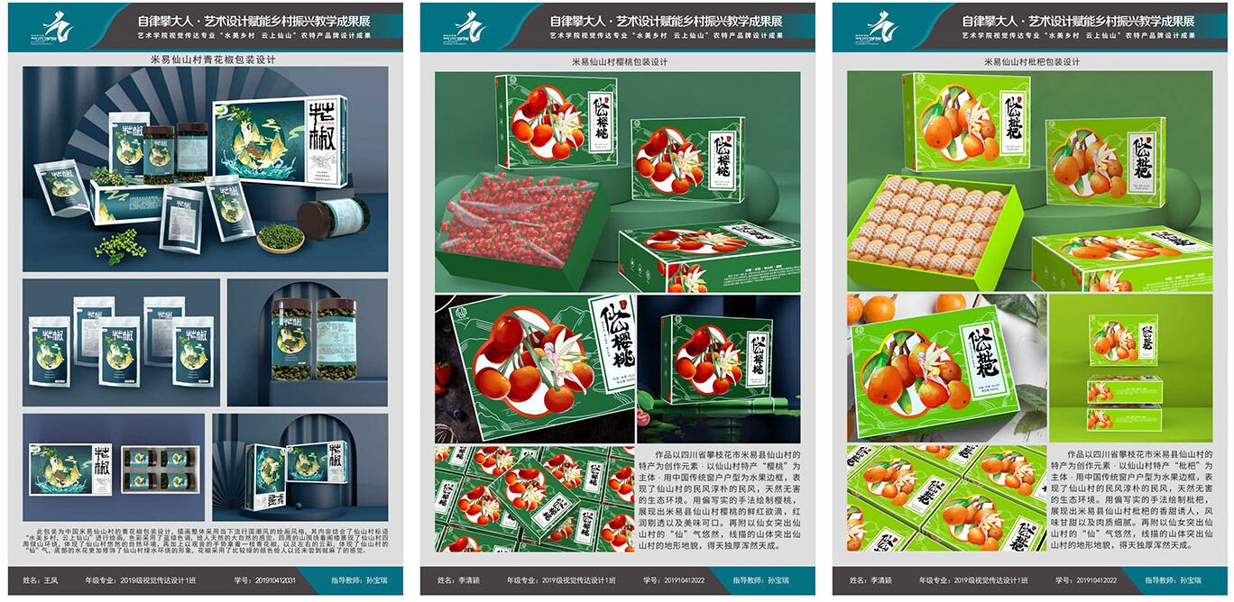 一是课程教学“真题化”。将乡村的真实需求引入课堂。如省级一流课程《包装设计》,连续多年以米易县仙山村的芒果、核桃、山药等农特产品为设计对象;《景观设计》《民宿设计》课程将仁和区红岩村的公共空间改造作为课题。学生在学习专业知识的同时,直接面对市场、文化和工艺的挑战。二是毕业设计“项目化”。从2014届开始,学院推行毕业设计100%真题真做改革。每年由合作地方政府和乡村出题,提出他们在农产品品牌升级、公共空间优化、人居环境改善、乡村规划更新、旅游文创产品设计开发以及文化宣传等方面的具体需求,经学院审核后作为毕业设计选题库。学生与指导教师“揭榜挂帅”,在长达半年的创作周期中,深入乡村调研,与村民、干部交流,反复打磨方案,围绕地方切实需求开展创新设计实践。这一改革彻底改变了毕业设计闭门造车的传统,使其成为连接学院与社会的桥梁。三是社会服务“课程化”。将教师带领学生下乡服务,纳入第二课堂学分管理和教师工作量考核。每一次墙体彩绘、民俗调研、品牌策划,都是一次生动的“移动课堂”。学生在服务中了解国情、社情、农情,锤炼了解决实际问题的综合能力。