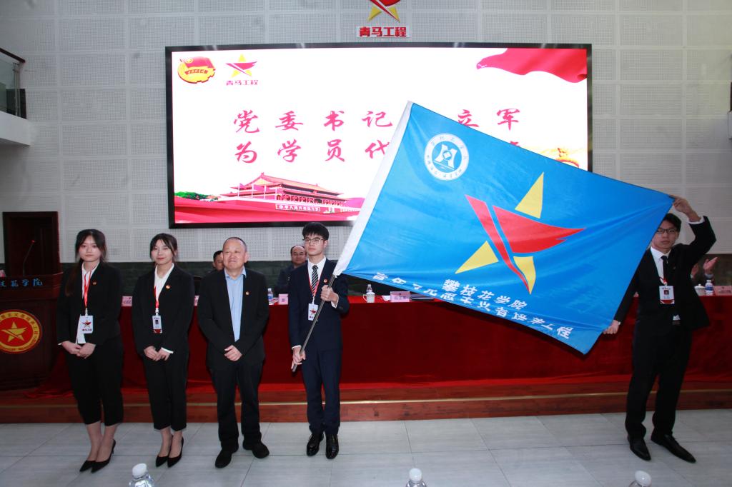 肖立军为“青马工程”大学生骨干培训班学员授旗。