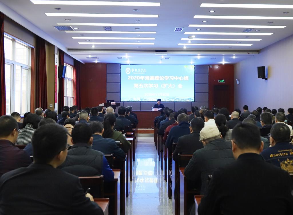 11月30日上午,我校2020年党委理论学习中心组第五次学习(扩大)会在办公楼四楼附楼会议室召开。会议的主题是:学习贯彻十九届五中全会精神,科学谋划学校发展,加强内涵建设,推动应用型一流大学建设再上新台阶。学校党委领导班子成员、全校副县级及以上干部、各单位助理以及部分特邀代表参会。党委书记王斌主持会议。