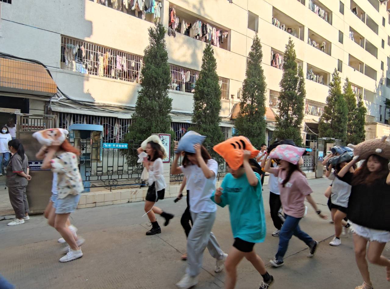 30秒后,教师、志愿者、公寓管理员组织学生根据各公寓楼栋平层学生先疏散、平层以上楼层的学生在教师、志愿者指挥下,依次间隔一分钟疏散的要求,按应急路线有序疏散到指定区域。