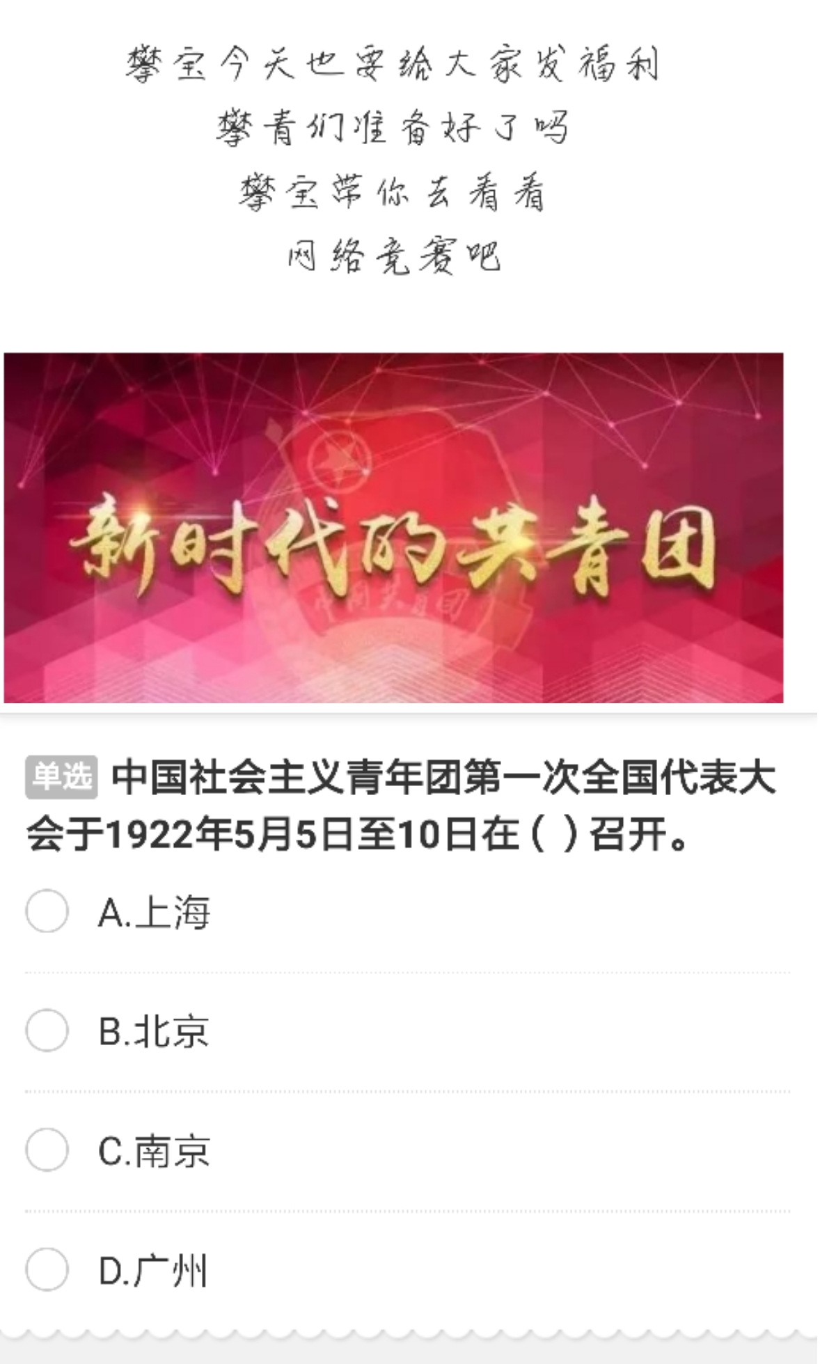 据悉,我校将通过此次竞赛,选拔出优秀的三名同学,在团委老师的带领下,参加由团市委、市直机关工委、市党委史研究室联合组织的“青春心向党·建功新时代”纪念五四运动100周年主题党团知识竞赛复赛。
