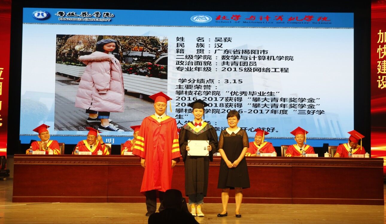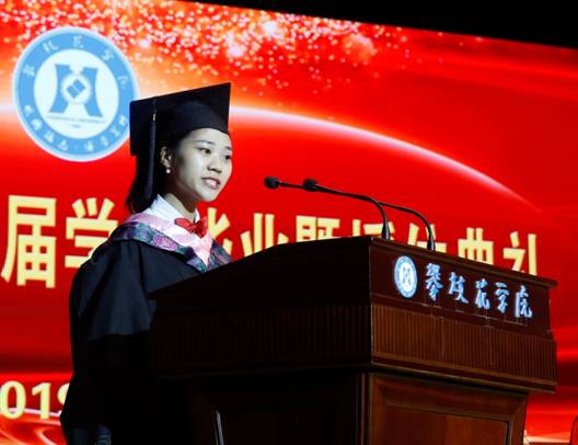 来自人文社科学院2015级汉语言文学专业的吴琼代表毕业生发言。她对母校的辛勤培养、老师的谆谆教导和同学的相知相伴表达了深深的感激和不舍之情,她表示,将会深深牢记习总书记在纪念五四运动100周年大会上对青年的寄语,志存高远,坚定信念,在各个工作岗位上,以攀大青年学子的学识、能力和气度,用汗水、用梦想,续写攀大故事、传播攀大声音、弘扬攀大精神、树立攀大自信、展示攀大水平!