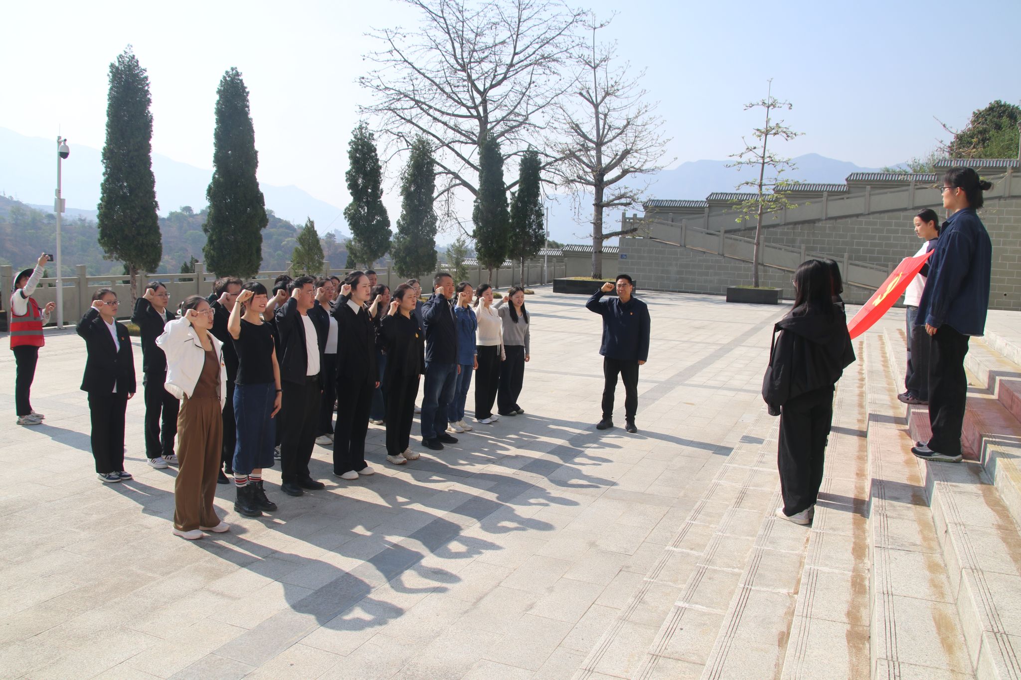 走进陵园,苍松翠柏环绕,纪念碑巍然矗立,全体党员师生身着正装、佩戴党员徽章,怀着崇敬之心整齐列队,在讲解员引导下,依次参观纪念广场、烈士墓、英名墙等纪念设施。重温入党誓词仪式在烈士纪念碑前举行,全体师生党员高举右拳,面向党旗庄严宣誓。宣誓仪式结束后,全体师生党员手持菊花,缓步走向烈士纪念碑与烈士墓区,依次敬献鲜花、肃立默哀。