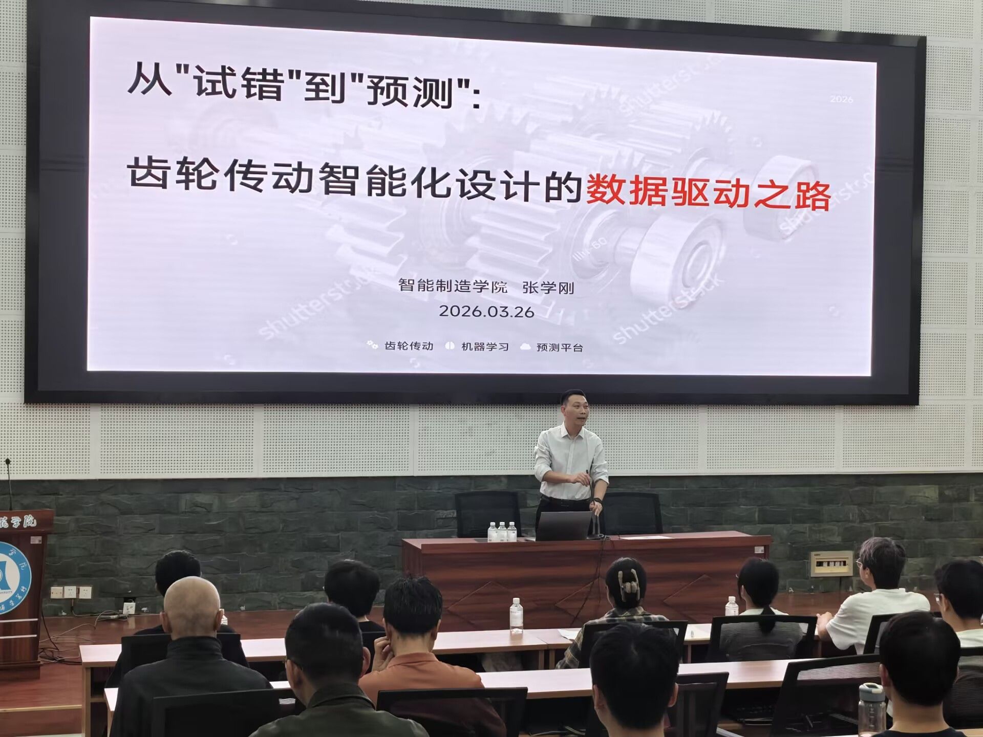 为整合校内外优质资源,打通“理论—科研—产业”衔接通道,智能制造学院设立“智行讲堂” 学术讲座。3月26日晚,“智行讲堂”首期学术讲座开讲,智能制造学院张学刚老师应邀以《从“试错”到“预测”:齿轮传动智能化设计的数据驱动之路》为主题开展讲座,吸引了学院众多师生到场聆听。