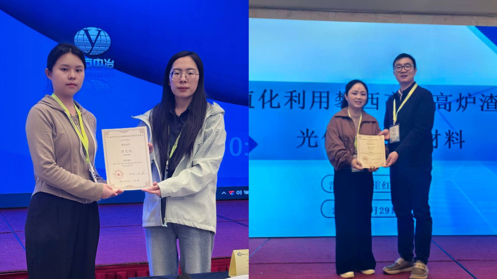 会议期间,师生们通过大会报告、分会场研讨等形式,与国内专家学者开展广泛深入的学术交流。杨绍利教授作了题为《攀西地区钒钛磁铁矿资源禀赋及其深度综合利用技术发展方向的思考和建议》的报告,聚焦攀西特色资源,探讨了固废资源化利用的新路径;张远老师《钢铁行业含锌烟尘资源化利用研究进展》的报告,系统梳理了该领域的技术现状与发展趋势。王力霞老师分享了《含钒炉渣绿色低碳提取与提纯工艺进展》有关内容,为钒的清洁提取提供了新思路。4名硕士研究生在青年组交流汇报,其中2023级研究生陈光润的《基于铝热还原的短流程钛合金制备与组织性能研究》、肖建的《南非熔分钛渣酸解过程物相演变与界面传质机制》获得了优秀研究生报告。
