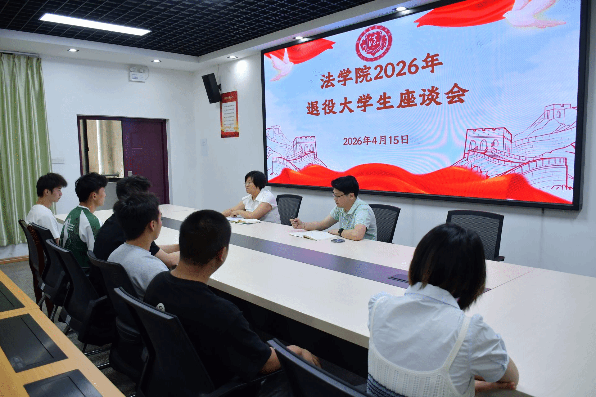 退役大学生座谈会上,张琳围绕学业帮扶、就业指导、考研规划等核心内容详细解读退役复学扶持政策。针对参会学生提出的疑问,老师们逐一答疑,并结合法学专业特点给出建议。