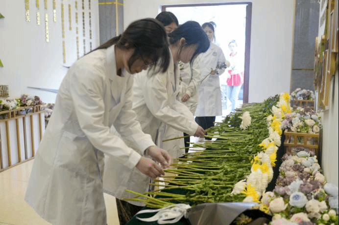上午9时,全体人员肃立默哀,向遗体捐献者致敬。市红十字会领导在致辞中表示,遗体捐献者为医学教育提供了重要教学资源,应当持续强化医学人文教育,引导学生践行“敬畏生命、精进医术”的初心。捐献者家属代表回顾了亲人自愿捐献遗体的过程,她表示,亲属生前基于推动医学进步的考量捐献遗体,既是生命最后的奉献,亦是对“人道、博爱、奉献”精神的切实践行。受捐者代表分享了接受器官移植后重获健康的经历,呼吁社会关注遗体与器官捐献事业。随后,全体医学生重温《医学生誓言》,仪式最后,全体人员向遗体捐献者敬献上代表高洁和追思的菊花,表达感恩和尊敬。