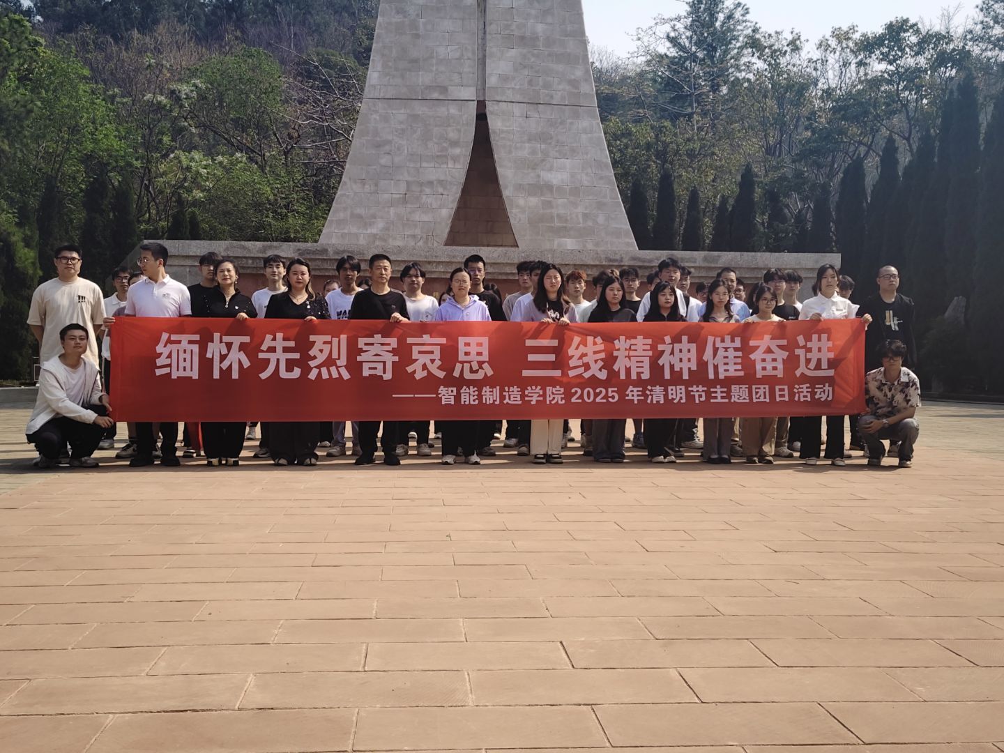 活动伊始,全体人员整齐列队,瞻仰烈士墓碑,献上手中鲜花,表达对先烈的追思。在庄重肃穆的氛围中,大家集体默哀,向为国家和人民英勇献身的先烈们表达沉痛哀悼与崇高敬意。学生党员李秋雨同学代表发言,他说,回顾先烈们的事迹,先烈们用热血浇筑了这片土地的辉煌,我们要以实干担当告慰英魂,让三线精神在新时代焕发新光彩。同时,为表达赤诚之心,李秋雨同学带领大家在烈士纪念碑前,全体党员高举右拳,面对鲜红党旗重温入党誓词。活动尾声,全体参与人员在英雄纪念碑前合影留恋。